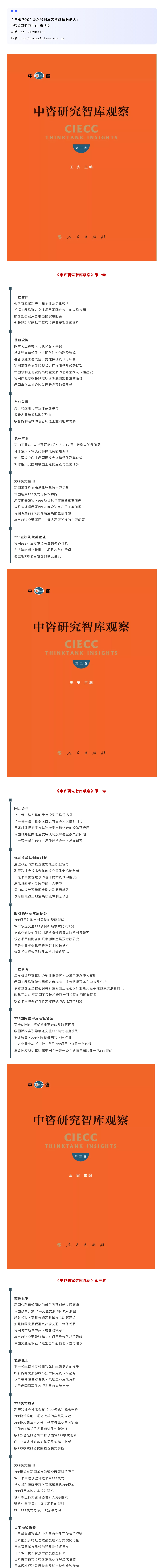 藏諸名山,傳之其人。中咨公司擬將《中咨研究智庫觀察》品牌工程持續(xù)推進下去,研究中心目前正積極開展《中咨研究智庫觀察》第二批圖書的文章征集刊發(fā)等相關工作,希望社會各界更加關注“中咨研究”微信公眾號,同時希望中咨公司本部及所屬企業(yè)員工及離退休老專家,繼續(xù)為“中咨研究”微信公眾號積極撰寫高質量文稿,以便納入《中咨研究智庫觀察》叢書公開出版發(fā)行,為中咨公司高端智庫建設不斷添磚加瓦。