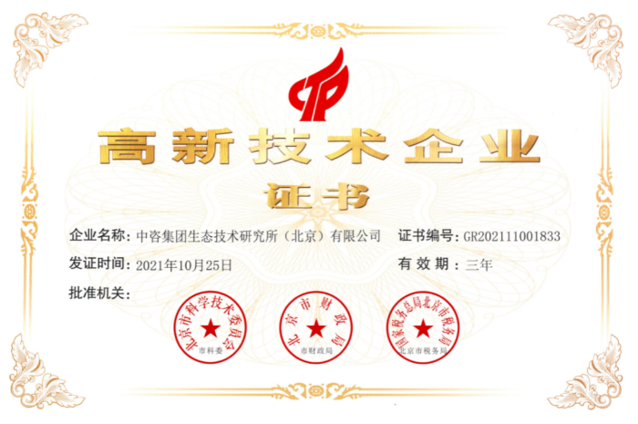 中咨生態(tài)技術(shù)研究所榮獲北京市高新技術(shù)企業(yè)證書