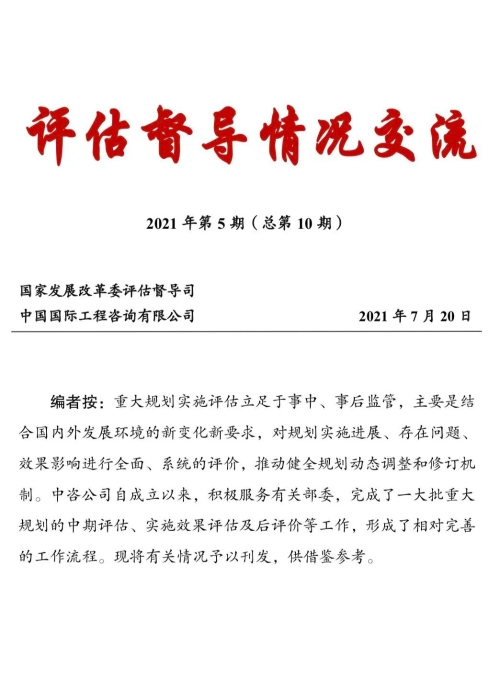編者按:重大規(guī)劃實(shí)施評(píng)估立足于事中、事后監(jiān)管,主要是結(jié)合國內(nèi)外發(fā)展環(huán)境的新變化新要求,對(duì)規(guī)劃實(shí)施進(jìn)展、存在問題、效果影響進(jìn)行全面、系統(tǒng)的評(píng)價(jià),推動(dòng)健全規(guī)劃動(dòng)態(tài)調(diào)整和修訂機(jī)制。中咨公司自成立以來,積極服務(wù)有關(guān)部委,完成了一大批重大規(guī)劃的中期評(píng)估、實(shí)施效果評(píng)估及后評(píng)價(jià)等工作,形成了相對(duì)完善的工作流程?,F(xiàn)將有關(guān)情況予以刊發(fā),供借鑒參考。